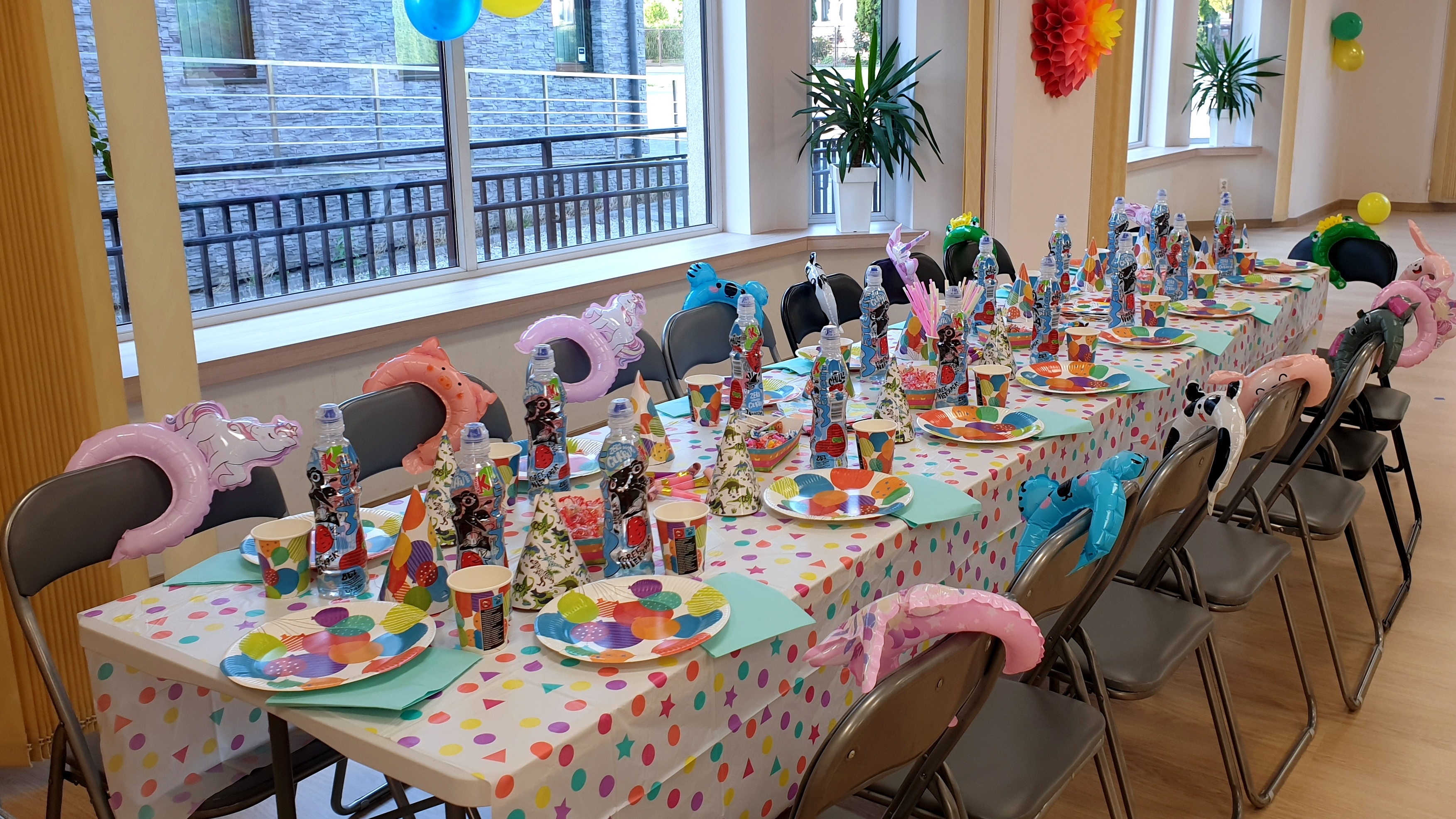 • Dekoracja sali: balony, serpentyny, kolorowa, plastikowa zastawa, stół na przekąski